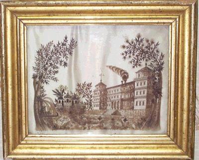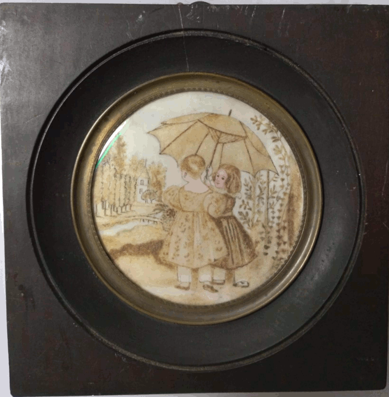 Hair painting is done by using finely ground hair as the “paint”. This technique is combined with the palette work technique to create painting of a unique nature. Sometimes, but not always a pastel color was added to create the sky, water, or a flesh tone, otherwise the only color used is the actual color of the hair. These pictures are sometimes called “Sepia Paintings”.